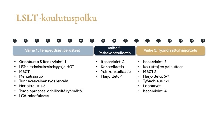 Koulutuksen rakenne ja suorittaminen; Koulutuksen foorumit ja niiden käyttö; Henkilökohtainen orientaatio koulutukseen – mikä on tavoitteesi ja mikä on sinulle tärkeää – itsensä esittely Discord-ryhmässä; Lukupiirin aloitus – aloitetaan keskustelu ryhmän kanssa; Lyhytterapeuttinen tavoitteellinen työskentely; Mielenterveyden haasteet ja niiden hoitaminen; Tutkimukseen perustuva terapia; Liikunta ja ravinto – oman elämän perustusten tarkastelu ja oma suunnitelma hyvinvoinnin edistämiseksi; Mitä Läsnäolon ja systeemisyyden terapia (LST) on?